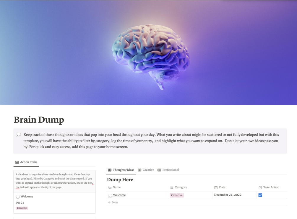 Keep track of those thoughts or ideas that pop into your head throughout your day. What you write about might be scattered or not fully developed, but with this template, you can filter by category, log the time of your entry, and highlight what you want to expand on. For quick and easy access, add this page to your home screen. Don't let your own ideas pass you by!